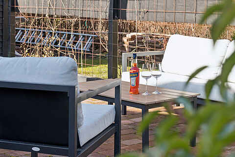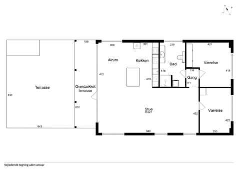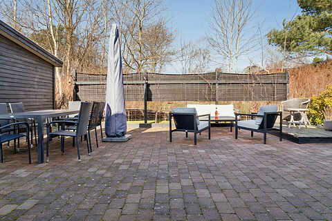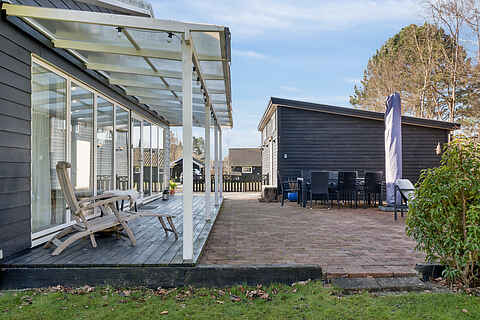 Her kan du nyde solen på terrassen eller trække under det overdækkede udeareal, når duggen falder eller vejret skifter.