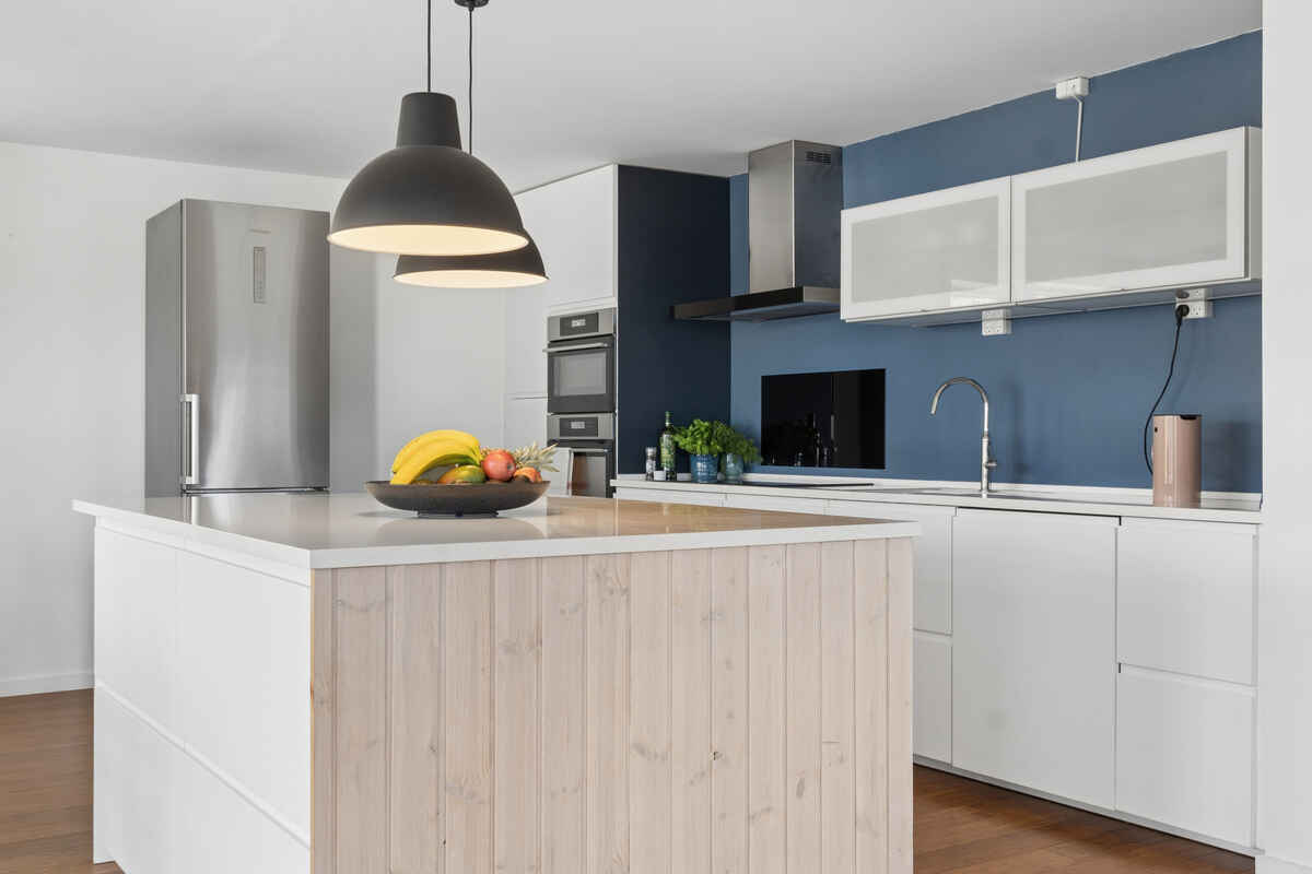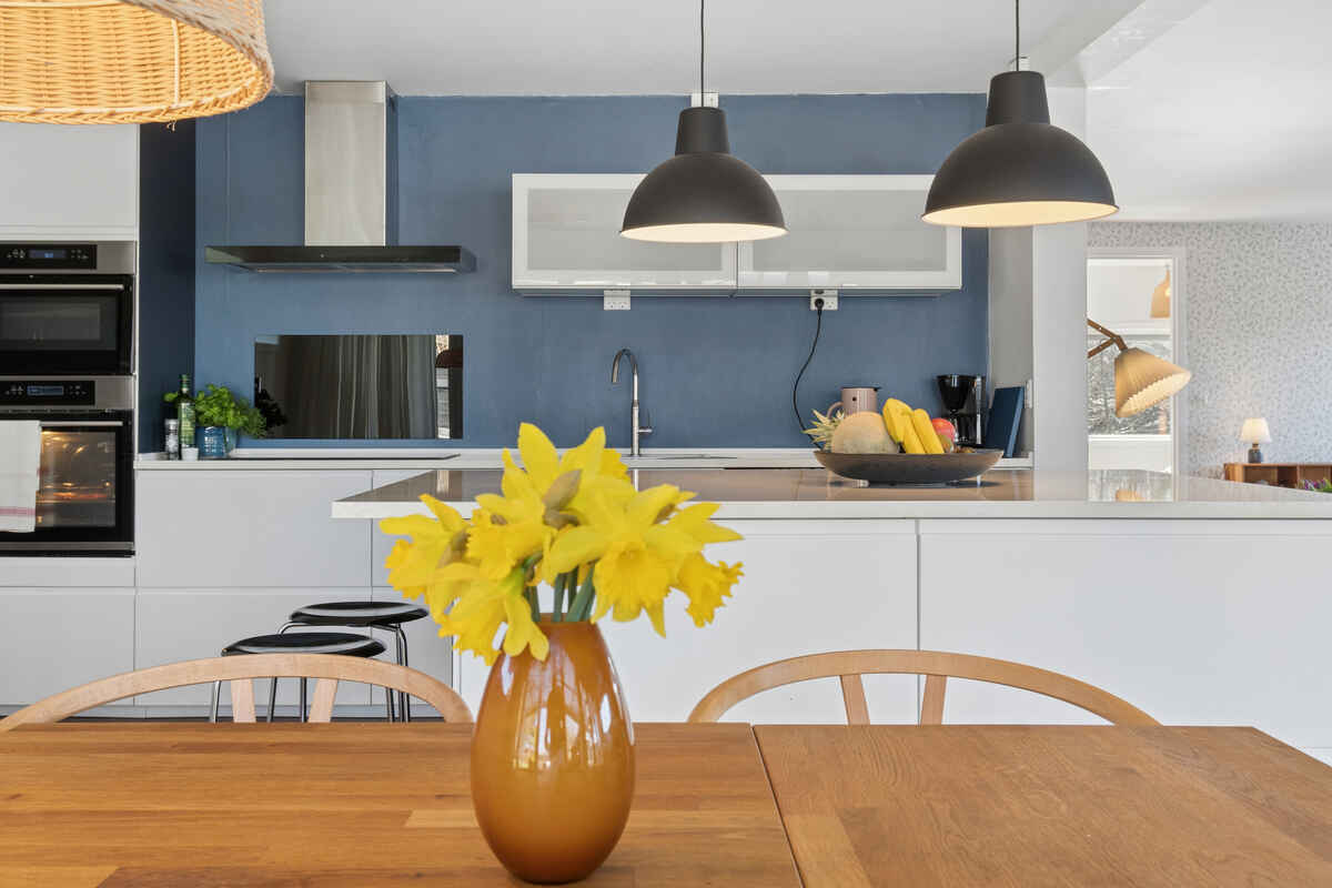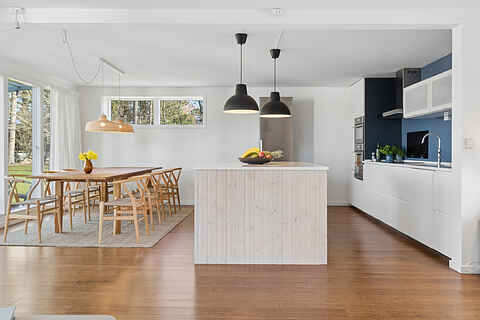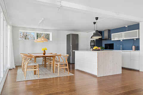 Køkkenet er funktionelt indrettet med god arbejdsplads og køkken-ø, mens stuen har plads til både spisebord og sofaområde, så rummet let kan tilpasses samvær og afslapning.