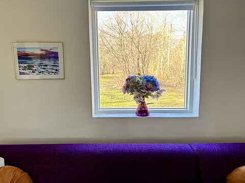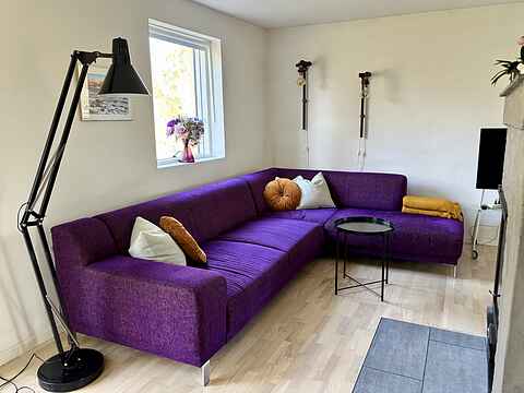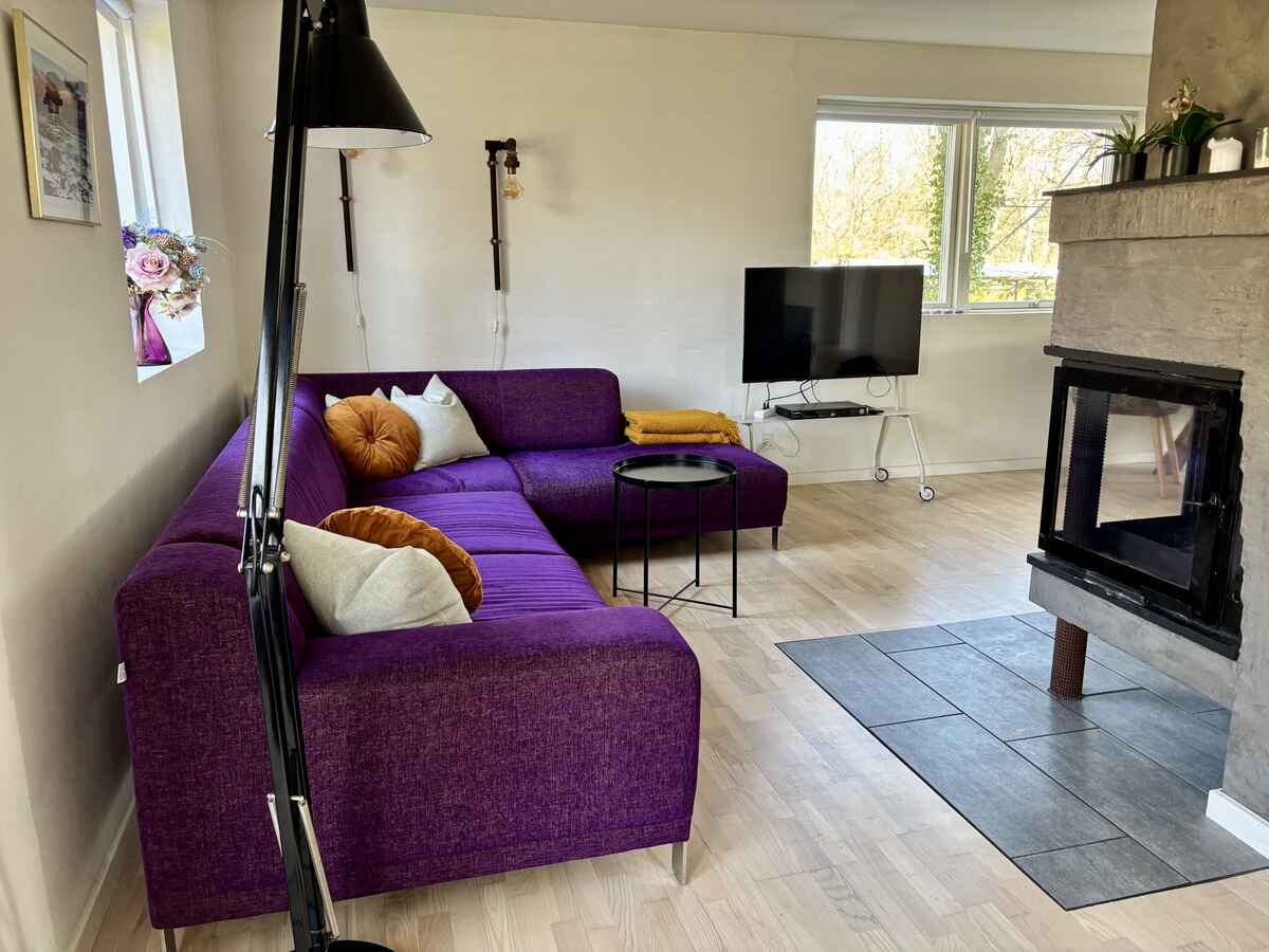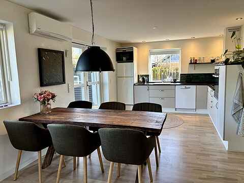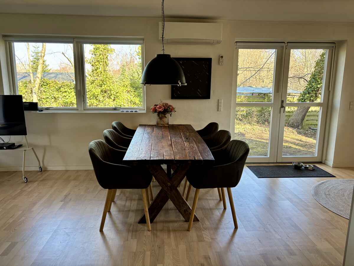 Den lyse og velindrettede stue har en skøn, stor hjørnesofa samt et helt unikt og rustikt spisebord med god plads omkring. Her er der mulighed for afslapning, samvær og hyggelige stunder. I stuen er der Chromecast til brug i huset, så I nemt kan streame jeres egne tjenester. Fra stuen er der dobbelte glasdøre med udgang til den dejlige terrasse med udsigt til alt det grønne.