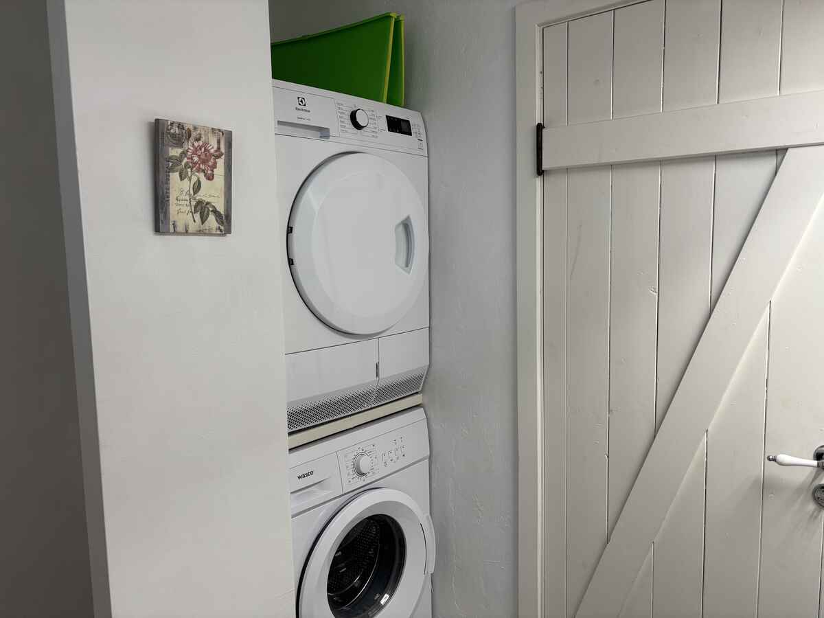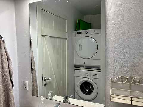 Pænt badeværelse med brusebad og gulvvarme. Der er både vaskemaskine og tørretumbler.
