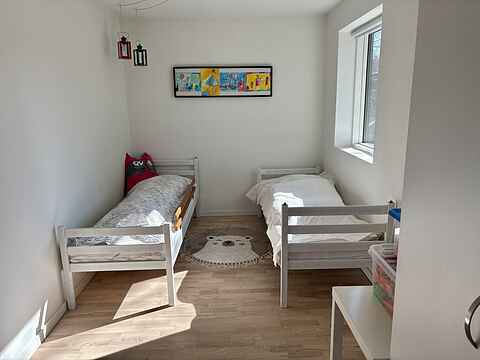 Huset rummer 3 soveværelser. To af værelserne er indrettet med enkeltsenge (90 x 200 cm), som kan stå samlet eller adskilt efter ønske. Det tredje værelse – børneværelset – har to enkeltsenge (70 x 190 cm) med gode madrasser, så også en “lille” voksen kan sove komfortabelt her.