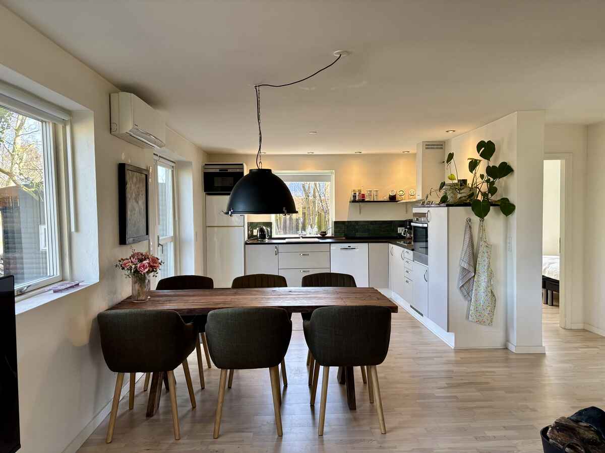 Dejligt, åbent køkken med blandt andet indbygningsovn og opvaskemaskine. Fra køkkenet er der ligeledes udgang til haven.