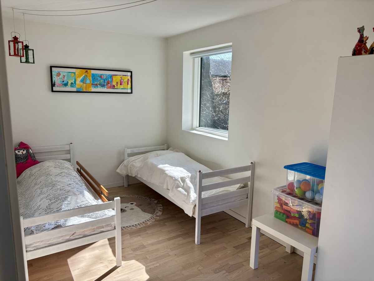 Huset rummer 3 soveværelser. To af værelserne er indrettet med enkeltsenge (90 x 200 cm), som kan stå samlet eller adskilt efter ønske. Det tredje værelse – børneværelset – har to enkeltsenge (70 x 190 cm) med gode madrasser, så også en “lille” voksen kan sove komfortabelt her.