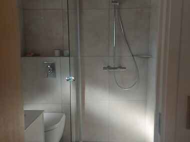 Badeværelset er funktionelt med bruseniche, væghængt toilet, håndvask samt opbevaringsplads i skuffer og skabe. Udenfor kan I nyde solen på den sydvendte terrasse, hvor der er god plads til grill, måltider og hyggelige stunder.