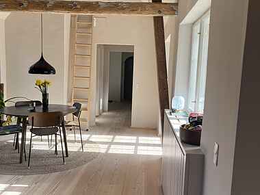 Indretningen kombinerer moderne komfort med original charme. Der er anvendt kvalitetsmaterialer som brede Dinesen Douglas-gulve, synlige bjælker og et stilfuldt, køkken i træ. Huset rummer et lyst soveværelse med direkte udgang til flisebelagt terrasse, stor stue/ spisestue med loft til kip. Selvstændigt køkken, hems med 2 sovepladser (sengen på hemsen er 1,20 m bred) og et badeværelse med bruseniche. Der er WiFi, tv, opvaskemaskine, vaskemaskine og fuldt udstyret køkken.