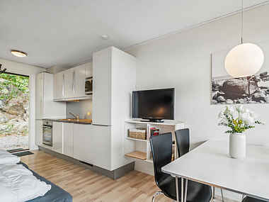 For dem, der ønsker at slappe af indendørs, er der både tv og internet, så du kan holde dig opdateret og underholdt under hele dit ophold. Køkkenet er fuldt udstyret med moderne faciliteter, så du nemt kan tilberede lækre måltider. Du kan nyde dine måltider i spiseområdet, mens du beundrer den smukke udsigt over havet. Der er også en lille hyggelig terrasse, hvor du kan nyde morgenkaffen eller et glas vin om aftenen.