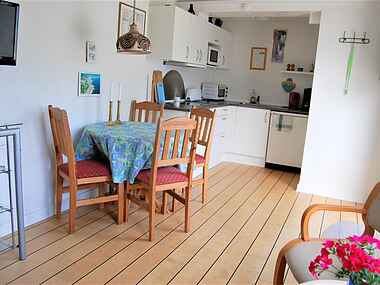 Hertil er der 1 badeværelse og et hyggeligt mindre opholdsrum med spiseplads til 4, mindre sofaområde med tv samt lille, men fint udstyret køkken med bl.a. køleskab, fryser, ovn, elkedel og kogeplader. Her er alt, hvad I skal bruge til at lave lækre måltider under jeres ophold.