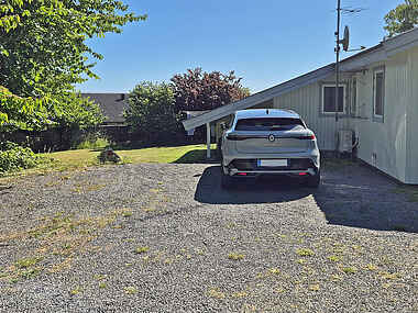 Udendørs er der stor grund samt en delvist overdækket øst- og sydvendt træterrasse med havemøbler og gasgrill, der er p-plads til 2 biler og elbillader. Der er 200 m til offentlig transport.