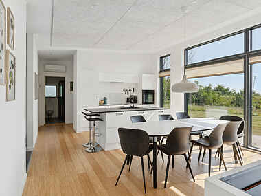 Huset er lyst og moderne indrettet og med kvalitets og bæredygtig matrialer og garanterer et kvalitetsophold på smukke Nordbornholm. I kommer til at tilbringe mange hyggelige og afslappende stunder i den rummelige opholdsstue med vanddamppejs, hvor I kan flade ud i gode møbler og se film, høre musik, spille spil eller bare hyggesnakke. I det åbne, veludstyrede køkken med tilhørende spiseplads er det en fornøjelse at tilberede lækre feriemåltider. Alle husets fire gode soveværelser og to flotte badeværelser har behagelig gulvvarme. Det samme har bryggerset, hvor I finder en vaskemaskine.
