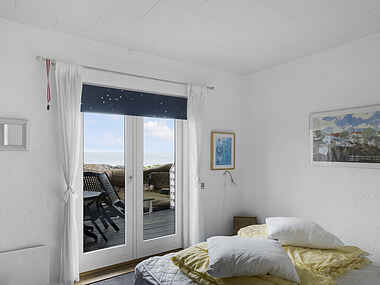 Det hyggelige soveværelse er udstyret med en komfortabel dobbeltseng og åbner sig op til en solrig terrasse, hvor eftermiddagslyset inviterer til afslapning og forfriskende stunder.
