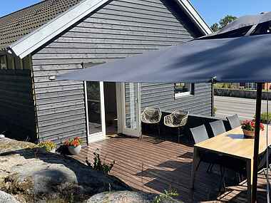 Grunden på 1200 m² inviterer til udeliv, med plads til leg, grill og ro. Den omkringliggende natur byder på vilde blomster, granitklipper og duftende enebær. Man kan gå i badekåbe til havet eller tage cyklen til byen.