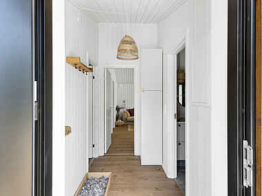 I entréen hvor i bliver budt velkommen, finder i knager til overtøj, en sko bakke til fodtøj samt et kosteskab.