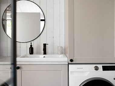 Badeværelset er indrettet med Newyorker glasvæg i brusenichen, vaskemaskine og rumlige opbevaringsskabe samt gulvvarme