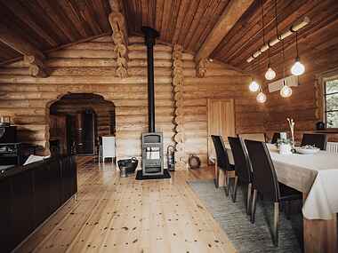 Dette hus er ikke bare en bolig, det er en sand hyldest til ægte træhåndværk, hvor massive bjælker udstråler autenticitet både indvendigt og udvendigt.