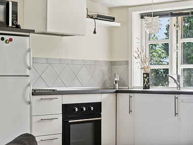 Den rummelige stue og køkken-alrummet er husets hjerte. Her er god plads til fælles aktiviteter og madlavning. Udenfor finder du en dejlig træterrasse med siddepladser og parasol, perfekt til solrige dage.
