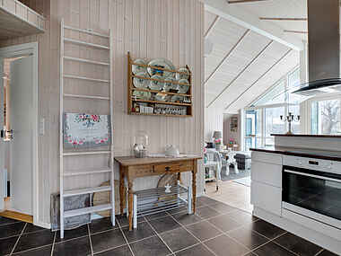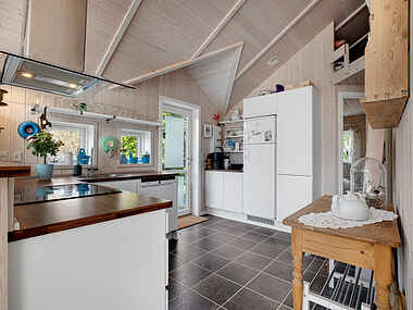 Dette charmerende sommerhus åbenbarer sig som et rummeligt hjerte, hvor stuen flyder naturligt sammen med køkkenet. Her opstår en stemning af samlende harmoni, der giver plads til afslapning, ro og nærvær. Hver detalje i indretningen er indbegrebet af hygge og hjemlig atmosfære, og fra stuen er udsigten til den frodige have som en portal til den omkringliggende natur. Dette sted er en oase, hvor pulsen falder, og sjælen finder ro.