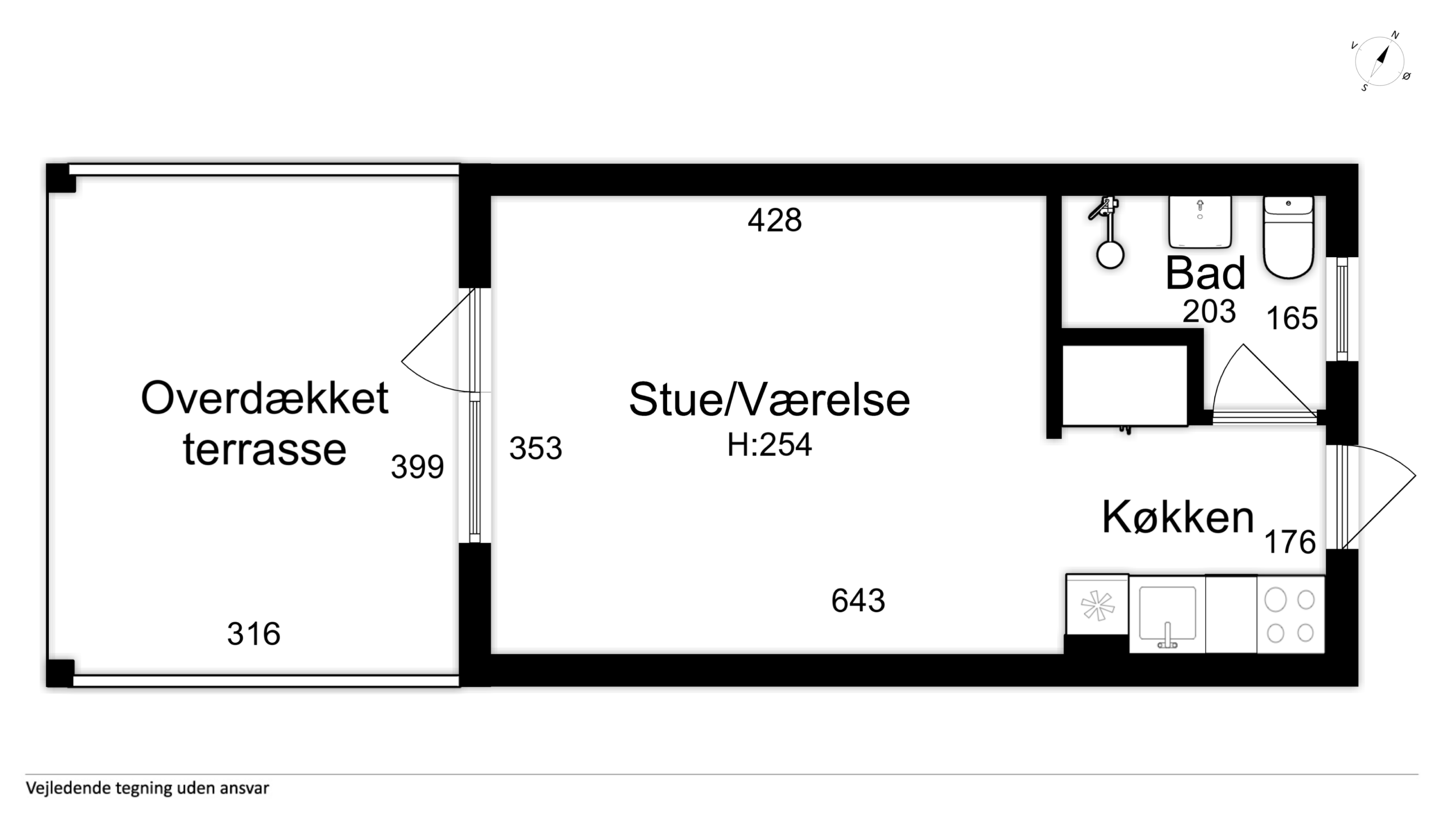 Badeværelset, som er ældre, er udstyret med toilet og bruser. Fra stuen er der adgang til en stor, overdækket og vestvendt terrasse, hvor solen kan nydes i læ hele eftermiddagen og aftenen.