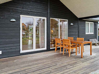 Hele vejen rundt om huset findes en træterrasse, hvoraf de 18 m2 er overdækket og der er havemøbler, gasgrill og legeredskaber til børnene. I den hyggelige have med bl.a. fyrretræer, sommerfuglebuske og havtorn kan I kan slappe af, nippe krydderurter til aftensmaden, spejde efter kaniner og lytte til fuglefløjt.