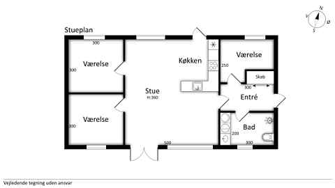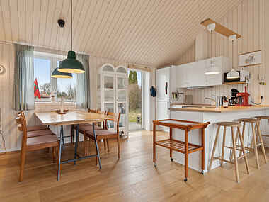 Det åbne køkkenalrum skaber rum til samvær og fællesskab, hvor I kan nyde en drink ved de høje egetræsbarstole, mens ungerne hygger sig i den 9 m2 store hems med ovenlysvindue. Huset prydes af smukt egetræsgulv, badeværelset er rummeligt og indrettet med lyse klinker og huset byder på tre velindrettede soveværelser. Køjeseng er kun 80 cm bred.