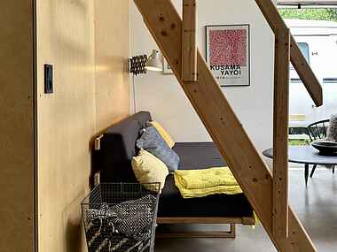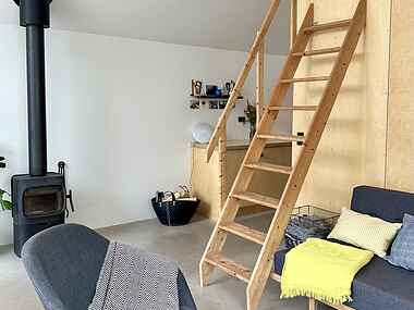 Fra stuen er der en stige op til en stor hems, hvor I kan flade ud i sækkepuder, mens I ser TV (udstyret med både Chromecast og Apple-TV). Her er også to sengepladser. Badeværelset har gulvvarme samt vaskemaskine/tørretumbler.
