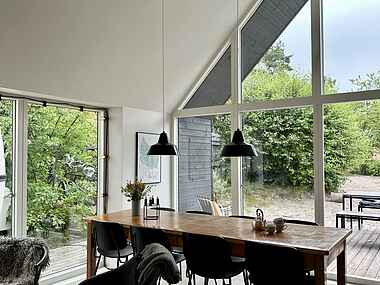 Der er åbent til kip i huset, hvilket i kombination med store vinduer skaber en rummelig og meget lys atmosfære. I husets store opholdsstue kan I slappe dejligt af, mens I ser fjernsyn, hører musik og om vinteren nyder varmen og den hyggelige atmosfære fra brændeovnen. I det åbne, veludstyrede køkken er det en fornøjelse at tilberede lækre feriemåltider.