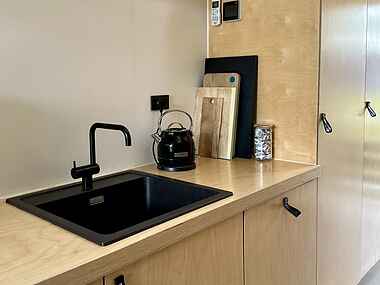 Fra stuen er der en stige op til en stor hems, hvor I kan flade ud i sækkepuder, mens I ser TV (udstyret med både Chromecast og Apple-TV). Her er også to sengepladser. Badeværelset har gulvvarme samt vaskemaskine/tørretumbler.