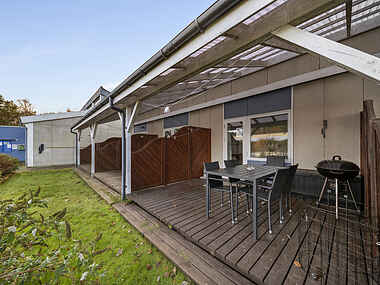 Tag et øjeblik på den overdækkede terrasse og lad dig fortrylle af udsigten til poolen. Her kan du nyde din morgenkaffe eller et køligt glas vin, mens du holder øje med børnenes sjove vandaktiviteter. Terrassen er udstyret med en grill til de lækre måltider, samt havemøbler med komfortable hynder. Der er også en hyndebox med plads til opbevaring samt diverse legetøj, ketcher, bordtennisbat og meget mere.