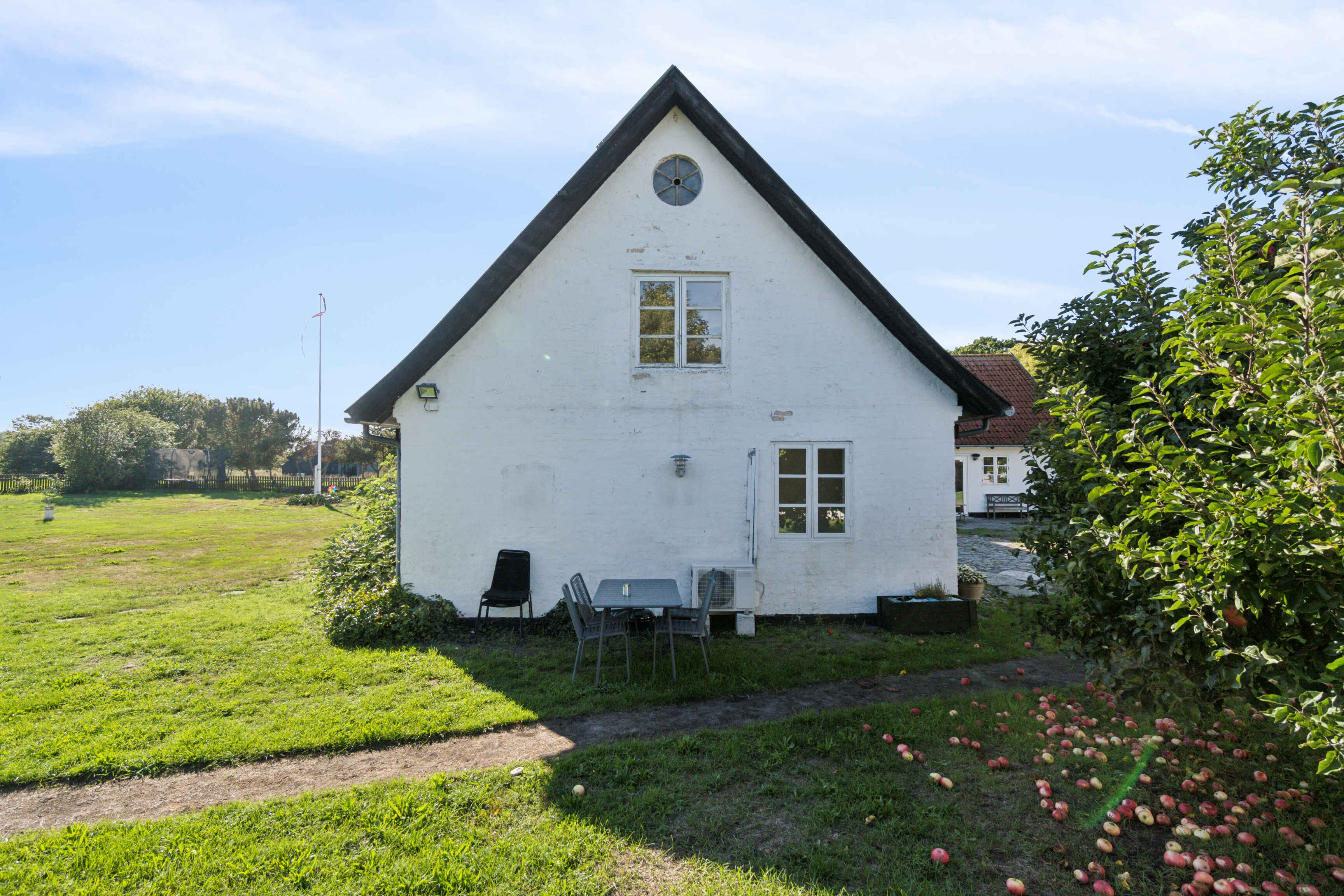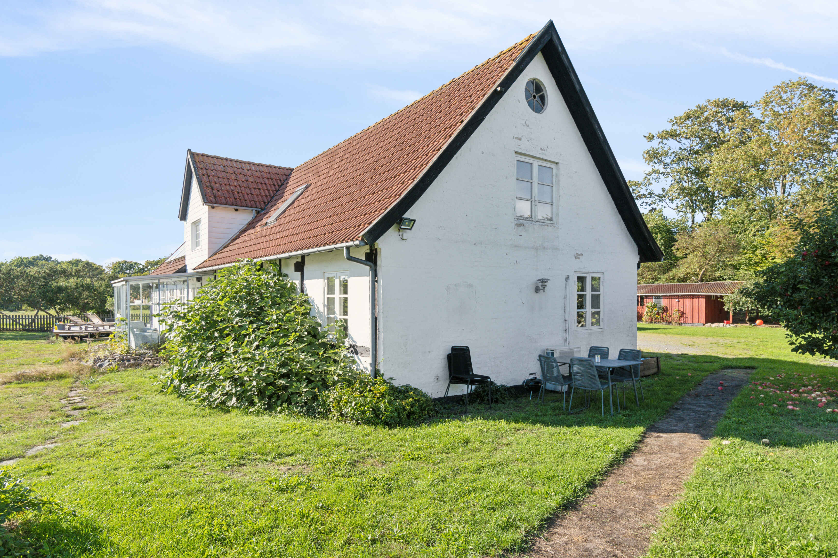 Indenfor er køkken, spisestue og opholdsstue forbundet, så madlavning og samvær går hånd i hånd. Køkkenet er adskilt, men stadig tæt på spiseområdet, hvilket skaber gode rammer for måltider og fælles hygge.