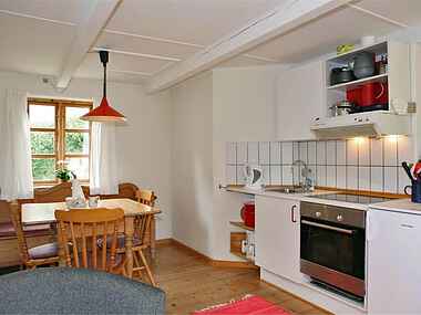 Køkkenet indeholder køleskab, komfur med ovn, vask, microovn, kaffemaskine, elkedel, toaster, elpisker og service til 4 personer.