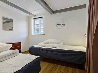Ved ankomst går man af terrassen ind i lejligheden, som er med køkken-stue i et rum, soveværelse med dobbeltseng 140*200 samt indbygget skabsplads, værelse med 2 enkeltsenge 90*200, toilet og bad er bagerste rum. I alt plads til 4 personer.