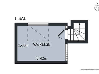 Stuen har et tv-hjørne og en arbejdsstation. Sovepladserne omfatter en køjeseng i en alkove og en dobbeltseng på en hems, tilgængelig via stige.