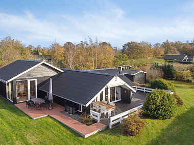 Huset ligger for enden af en stille vej med marker som nabo. Placeringen sikrer en privat og afslappet atmosfære, hvor I kan nyde naturen helt tæt på. Husets hjerte, er den lyse og rummelige stue. Huset byder på et stort alrum, to soveværelser og badeværelse. Fra huset og terrasserne, kan man nyde udsigten over fjorden, som skaber en hyggelig ramme for feriedagene.