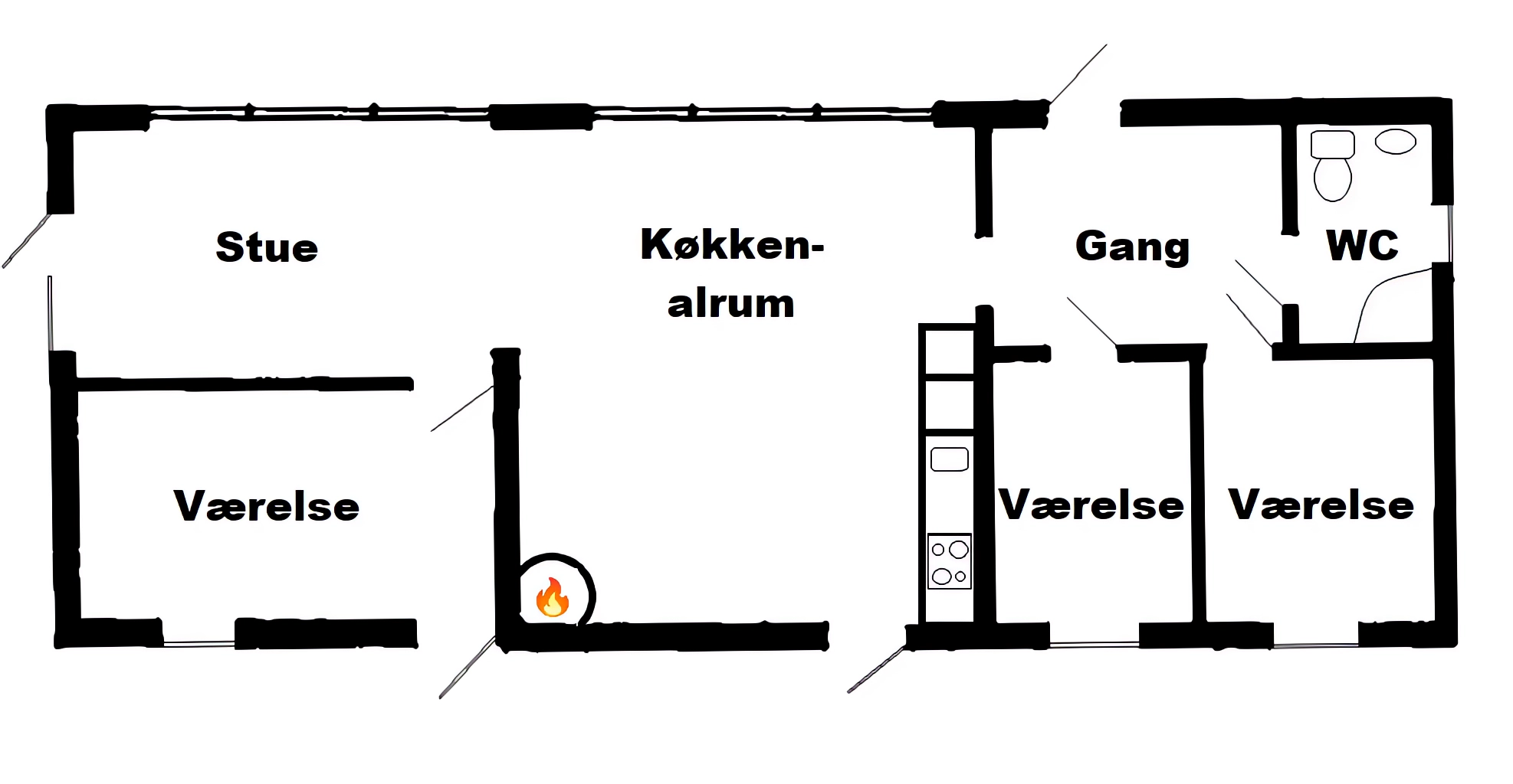 Der er tre værelser med otte sovepladser, et dejligt stort køkken-alrum med nyt køkken, TV-stue i forlængelse af køkken-alrummet, samt toilet med bad. Her er brændeovn til de mørke aftener og to dejlige terrasser til de lyse nætter.