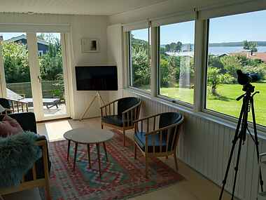 Stranden er kun 250 meter væk, og grundet husets placering 21 meter over havet er der en smuk vestvendt udsigt over fjorden, hvorfra du kan sidde på terrassen, eller ligge i hængekøjen, og nyde de mest fantastiske solnedgange.