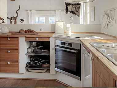 Inde finder du en varmepumpe, der sikrer behagelig temperatur året rundt. Køkken og stue er samlet i ét åbent rum med direkte adgang til terrassen, hvor havudsigten trækker blikket mod horisonten. Boligen har et lyst og funktionelt udtryk, der giver ro til ferien.