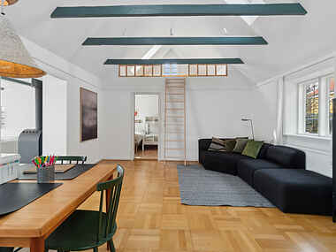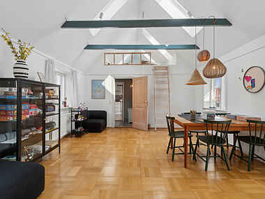 Der er to soveværelser, det ene med en dobbeltseng, det andet med en køjeseng og en enkeltseng. Derudover er der to madrasser på hemsen.