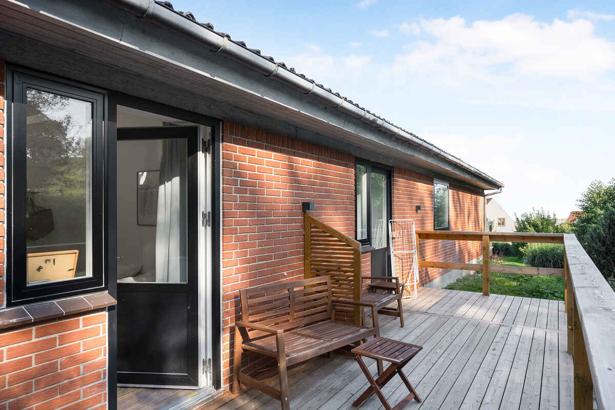 Desuden har lejligheden sin egen adgang til en stor terrasse, der ligger ud til den vilde natur. Fra gårdspladsen kan man bevæge sig ned i Solgårdens skønne store have, der er oplagt til leg, afslapning, frokost under æbletræerne, og alverdens solrige hyggestunder.