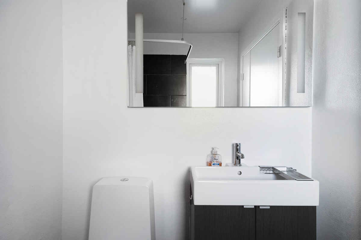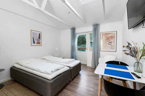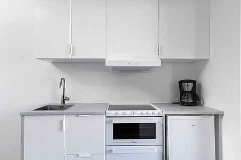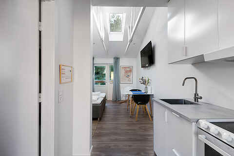 I dag er værelserne lavet om til små nyrenoverede lejligheder med eget badeværelse og eget køkken.