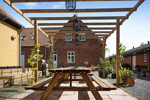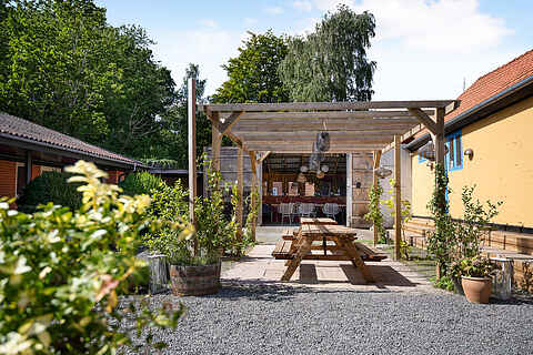 Stedet har et virkelig hyggeligt miljø på gårdspladsen, med en spiselade og stor bålplads.