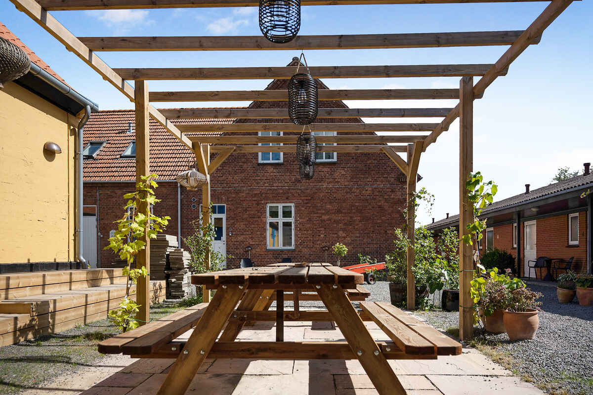 Desuden har lejligheden sin egen adgang til en stor terrasse, der ligger ud til den vilde natur. Fra gårdspladsen kan man bevæge sig ned i Solgårdens skønne store have, der er oplagt til leg, afslapning, frokost under æbletræerne, og alverdens solrige hyggestunder.