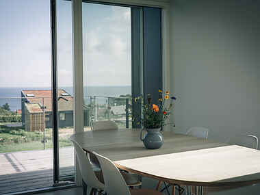 1. salen er en hyldest til panoramaudsigt og samvær. En elegant spiseplads til otte personer inviterer til gode middage, og en sofahjørne er skabt til afslappende stunder. Træd ud på balkonen, som åbner sig med en betagende udsigt over Østersøen. Her kan I indtage morgenkaffen med en kulisse af bølgende vande eller lade hvidvinens forførende smag akkompagneres af horisontens maleriske skifte i farverne.