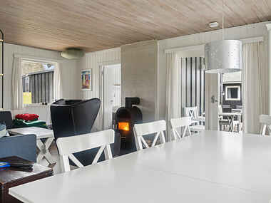 Stuen har et stort spisebord, som kan udvides, og byder på underholdning via YouSee, Disney, Netflix og lynhurtigt fibernet. Køkkenet er nyt fra 2024 og har alt, hvad I har brug for til feriemadlavningen.