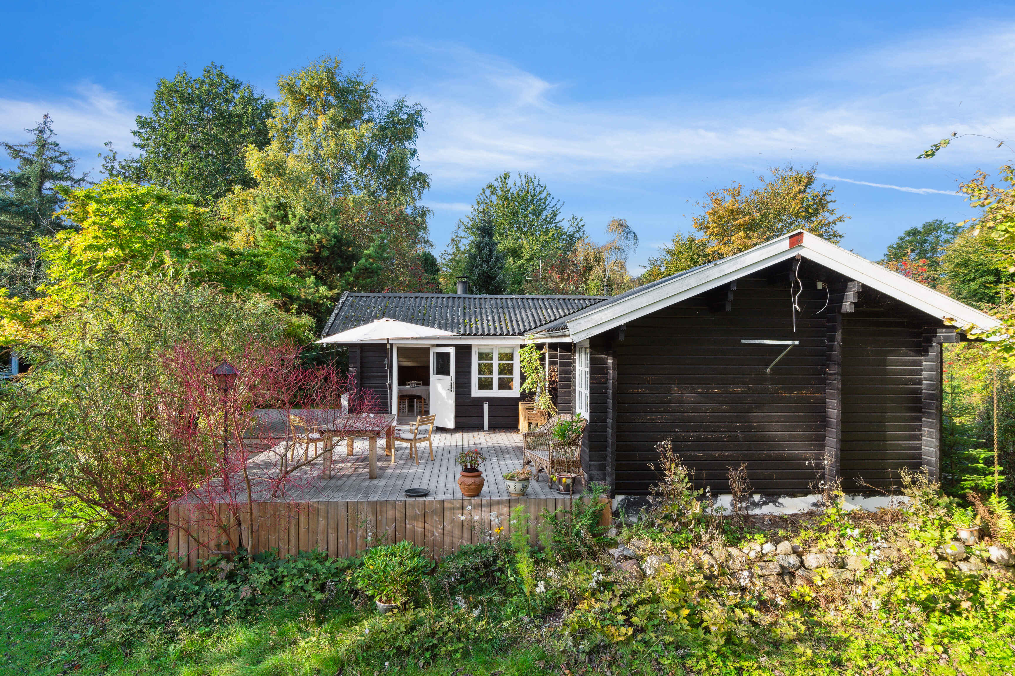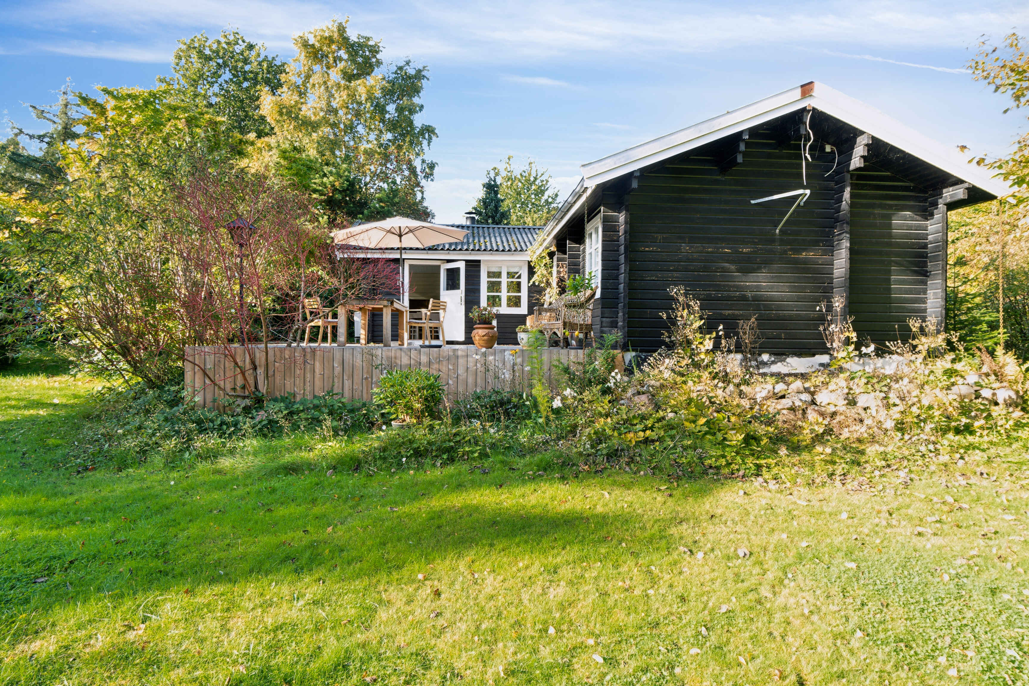 Udendørs kan I nyde den store, private have fyldt med idyllisk beplantning og smukke træer, små kroge og skyggefulde træer, hvor I kan lege med familien eller blot læne jer tilbage og nyde solskinnet. Den nybyggede træterrasse fungerer som en samlingsplads for udendørs spisning og hyggelige sommeraftener.