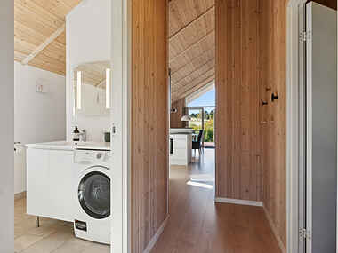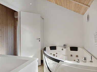 Badeværelset har et dejligt afslappende stort spabad som kan anbefales. Eller man kan benytte brusenichen. Desuden er der en kombi vaskemaskine og tørretumbler.