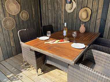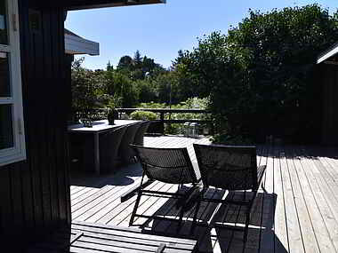 Huset er godt og højt placeret og fra den sydvest vendte del af terrassen har man et kig til en lille sø med et rigt fugleliv. Der er desuden terrasser hele vejen rundt om huset og i forbindelse hermed findes et hyggeligt overdækket område. Man kan derfor selv vælge om man vil sidde i skyggen eller nyde solen hele dagen. Hele den øverste del af grunden er indhegnet.