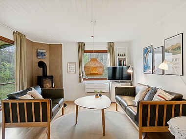 Sommerhuset rummer tre soveværelser og har plads til seks gæster, hvilket gør det perfekt til en familie eller et lille selskab. Med et rummeligt køkken-alrum, brændeovn og et lille ekstra rum med skrivebord kan alle finde deres plads i huset.