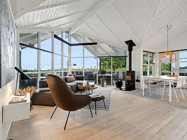 Indendørs byder sommerhuset på en indbydende atmosfære med tre komfortable soveværelser – to med dobbeltsenge og et med enkeltseng – samt en rummelig hems med to ekstra sovepladser. Den store, lyse stue imponerer med sin loftshøjde og store vinduespartier, der åbner op for den betagende udsigt.