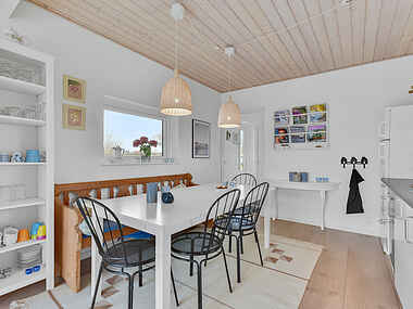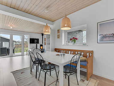 Sommerhuset byder på dejlig lys stue i åben forbindelse til køkkenet med hyggelig spiseplads. Fra stuen adgang til den store terrasse, der går hele vejen rundt om huset og byder på både sol og skygge.