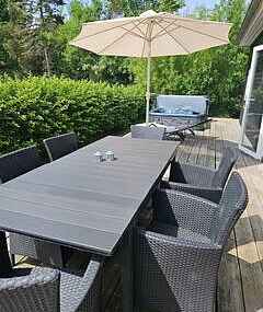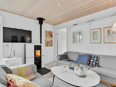 Sommerhuset byder på dejlig lys stue i åben forbindelse til køkkenet med hyggelig spiseplads. Fra stuen adgang til den store terrasse, der går hele vejen rundt om huset og byder på både sol og skygge.