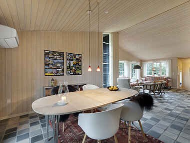 Huset er indrettet med et kombineret opholds- og spiserum med veludstyret køkken. Fra spisebordet er der udsigt til vandet, og der er plads til hygge for hele familien i sofagruppen, der er indrettet med flere sofaer, lænestole, små borde og læselamper. I opholdsrummet er der tv, radio samt CD-afspiller. Der forefindes chrome dongle og HDMI-stik for tilslutning til TV’et. Huset har gratis fibernet, som kan anvendes trådløst eller kablet.